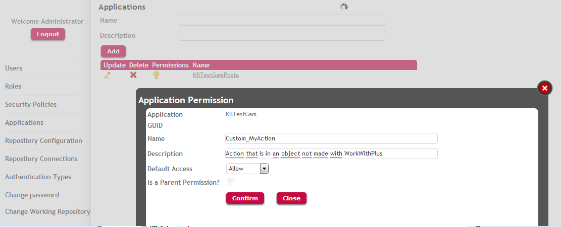 アプリケーションの Web パネルは WorkWithPlus を使用して 100% 生成することができます。しかし、場合によっては WorkWithPlus を使用しないで作成されたオブジェクトも存在します (例: 移行されたナレッジベースの場合、新しいオブジェクトは WorkWithPlus を使用して作成されますが、古いオブジェクトは WorkWithPlus を使用していません)。 WorkWithPlus を使用しないで作成されたオブジェクト内へのアクションまたはリンクの権限を追加するためには、GAM Backoffice 内で権限を追加し、その名前に接頭語「custom_」を追加します。