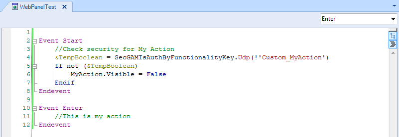 次に Web パネルで、アクションまたはリンクのセキュリティをチェックする場合のコードを追加する必要があります。例を次の画像に示します: