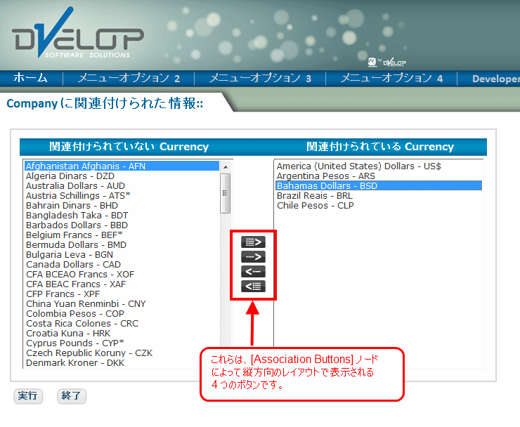 [Layout]: 関連付けボタンのレイアウトを指定します。オプションは [Vertical] または [Horizontal] です。上の例では、[Association Buttons] の [Vertical] でのレイアウトを示しています。