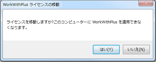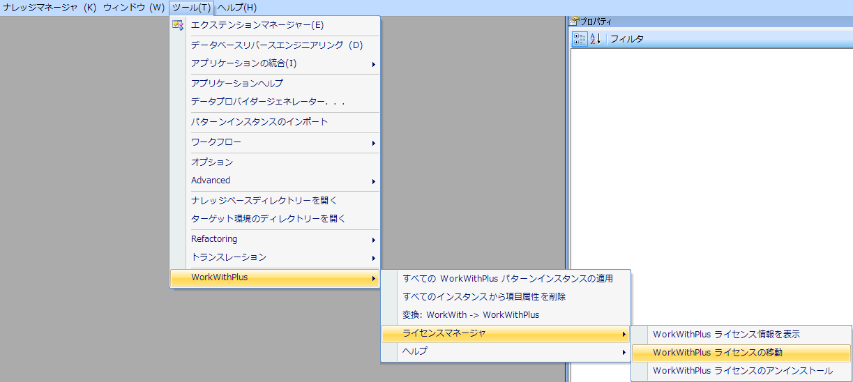 1- [ツール] -> [WorkWithPlus] -> [ライセンスマネージャ] -> [WorkWithPlus ライセンスの移動] の順にライセンスを移行するためのオプションを選択します: