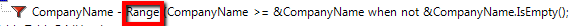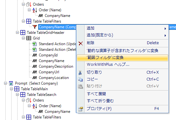 WorkWithPlus は、標準または動的な演算子が含まれたフィルタを、範囲フィルタに変換することができます。これを実行するには、フィルタを右クリックし、[‘範囲フィルタ’ に変換] オプションを選択します。