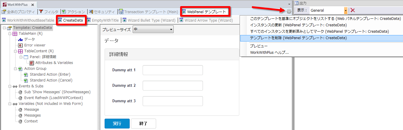 作成した Web パネルテンプレートを削除できます。この場合は、削除する Web パネルテンプレートをクリックし、アクションボタン -> [テンプレートを削除 (WebPanel テンプレート: <テンプレート名>)] をクリックする必要があります。
