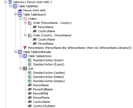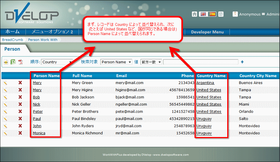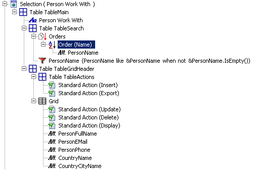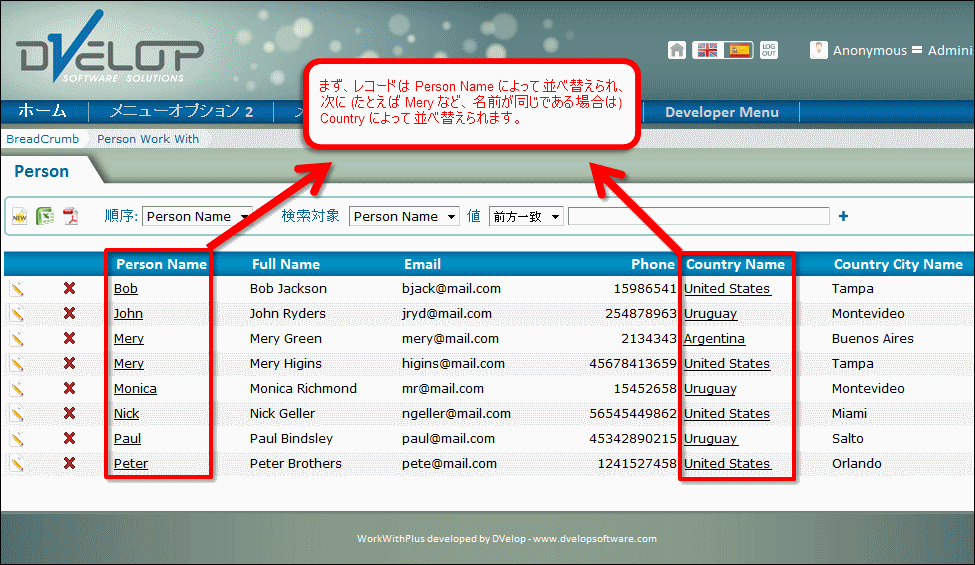 たとえば、この場合、[Order] ノードには 1 つの項目属性のみがあるため、グリッドは PersonName によって並べ替えられます。ただし、たとえば CountryName など、もう 1 つの項目属性をこの [Order] に追加する場合、1 番目の項目属性として「PersonName」、次に「CountryName」 (またはその逆) を設定する 2 つのオプションが用意されます。このオプションでは、異なる順番でレコードが表示されますが、どちらにも同じ項目属性が含まれます。