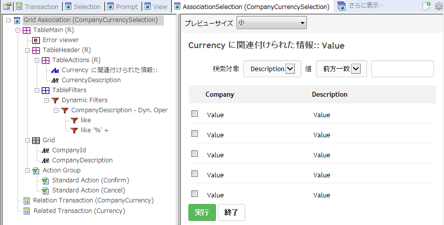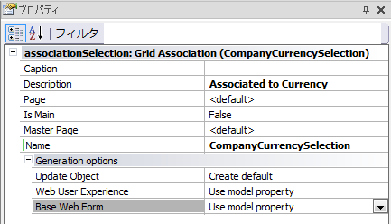 [Caption]: Association Selection オブジェクトの Web ページに設定されるタイトルを指定します。固定された特定の値を設定する場合、単一引用符 (') で括られた値を取得する必要があります。たとえば、Currencies をフォームのタイトルとして表示する場合、'Currencies' を設定する必要があります。このプロパティが空の場合、Web ページのタイトルはこのノードの [Description] プロパティから取得されます。 [Description]: デスクリプションのノードを指定しますが、オブジェクトの [Description] プロパティには割り当てられません。 [Page]: グリッドによって表示されるページごとの行数を指定します。このプロパティは、[<default>]、[<unlimited>]、[Page.Rows]、またはグリッドに表示する行数を直接設定できます。このプロパティが [<default>] の場合、値は [WWP Configuration] -> [Grid] ノード内のプロパティ [Page] から取得されます。このプロパティが [<unlimited>] の場合、グリッドにはページングが設定されません (すべてのレコードはグリッドページ内に表示されます)。 [Is Main]: 生成された Web パネル (Association Selection) がメインプログラムとして設定されるかどうかを指定します。 [Master Page]: Association Selection オブジェクトに割り当てられるマスターページを指定します。[<default>] を割り当てると、この値は [WWP Configuration] -> [Master Pages] ノード内のプロパティ [Selection] から取得されます。[(none)] を割り当てると、[Selection] にはマスターページが含まれません。 [Name]: [Association] ノードを識別する名前を指定します。このプロパティの値は、オブジェクトの名前内で接尾語として連結されます。
