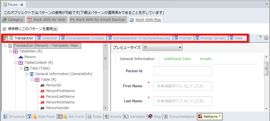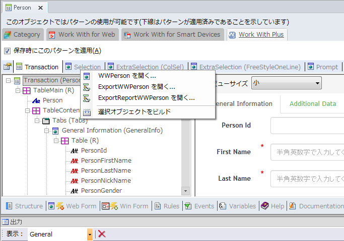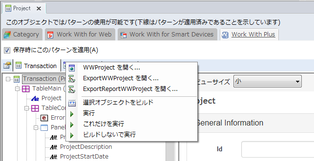 タブにある、各 WorkWithPlus インスタンス用に生成されたオブジェクトの項目では、いくつかのオプションを使用できます: