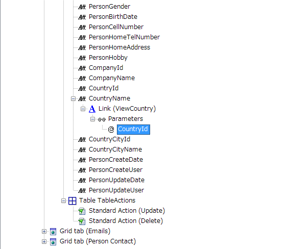 [Name]: パラメーターの名前を指定します。オブジェクトへのパラメーターとして設定する変数または項目属性が識別されるため、このプロパティに値を設定する必要があります。パラメーターによって項目属性を示す必要がある場合、その名前を厳密に入力する必要があります。例としては、CountryId が挙げられます。また、パラメーターによって変数を示す必要がある場合、名前の前には「&」が必要です。この変数は、たとえば &PersonId など、項目属性と同じ名前が付けられている場合にのみ、オブジェクト ([Selection]、[Transaction] など) 内に追加されます。そうでない場合、対応するオブジェクト内にユーザーが挿入するまで、変数は未定義です。