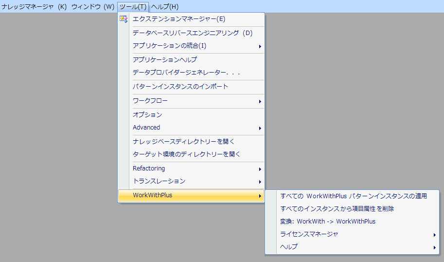 WorkWithPlus for Web では、GeneXus のメニュー内に、次のオプションを含むメニューを提供しています。