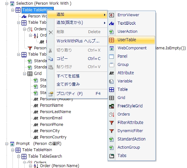 次に例を示します。Person トランザクションの [Selection] ノードに User Table を追加します。