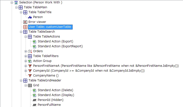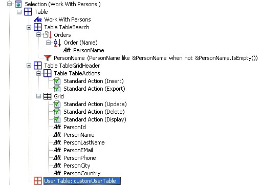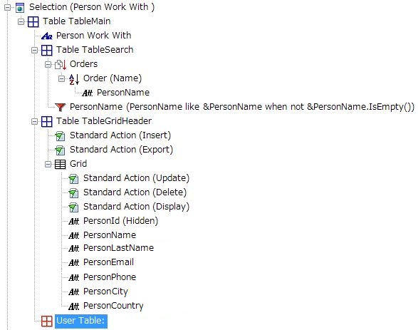 User Table を使用すると、任意のインスタンスオブジェクト (Transaction、Selection など) 内で難易度の高い、困難な開発を行う必要がある場合、より困難な方法でインスタンスパターンから実行してみる代わりに、GeneXus エディターを活用して生成されたオブジェクト内で直接実行することができます。