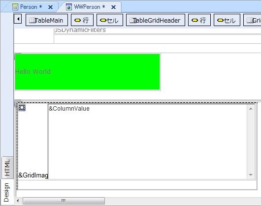 ここでは、テキスト (「Hello World」) を記述し、テーブルの背景色を変更してみます。