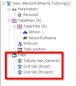 [Tabs] ノードの子は、[Tabular tab]、[Grid tab]、[Web Component tab] です。