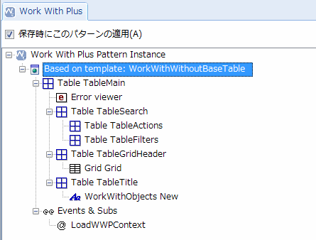 テンプレートノードに基づく Web パネル このノードには、パターンを適用する際に作成されるフォームを表示し、グループ化することがその目的であるため、プロパティがありません。この Web パネルは、[テンプレートの選択] オプションをクリックすると選択されるテンプレートに基づき、このノードの名前で表示されます。