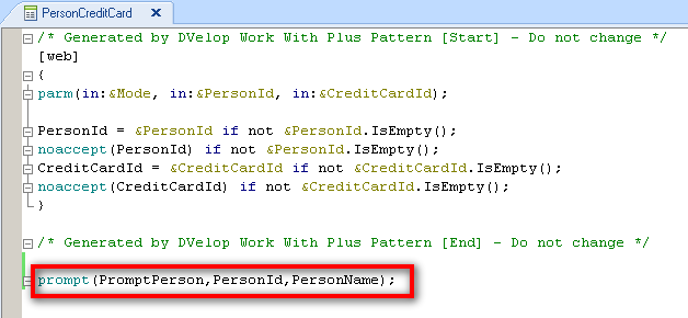 呼び出すトランザクションに Prompt ルールを設定する必要があります。この場合、PersonCreditCard トランザクションにこれを割り当てます。